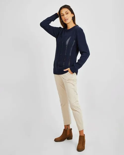 - Openwork design on the front, enhancing the sweater with intricate patterns that add a unique and stylish touch.