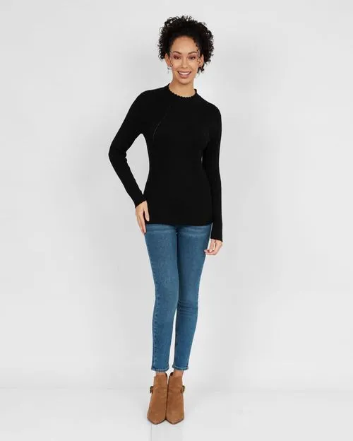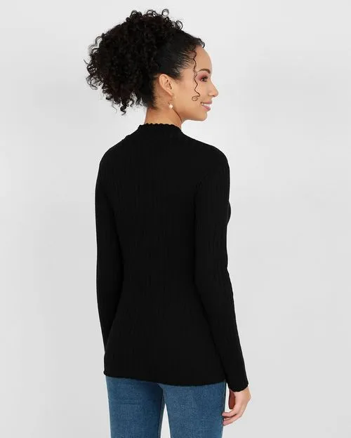 - Mock neck, providing a sleek and elegant neckline that enhances the sweater’s sophisticated look.